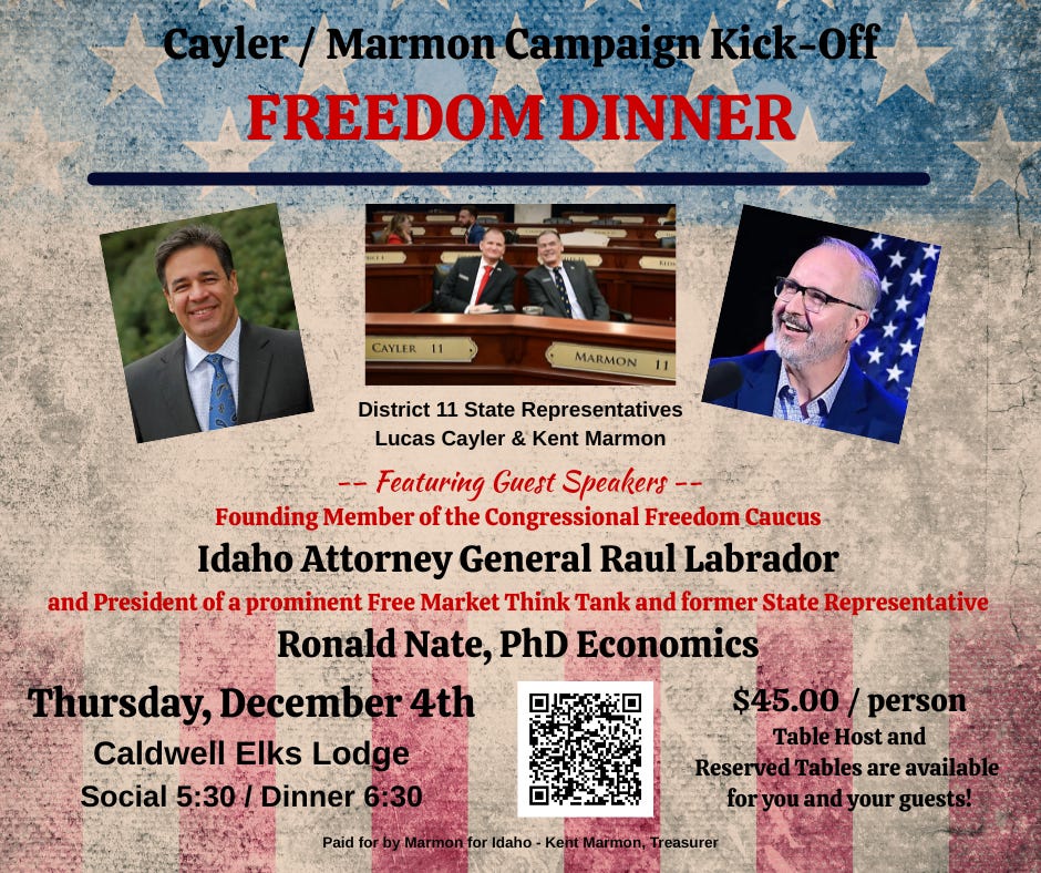 My partner in the House from District 11, Lucas Cayler, and I are putting together a Kick-Off Fund Raising Dinner that will be held at the Caldwell Elks Lodge on Thursday evening, December 4th.