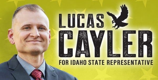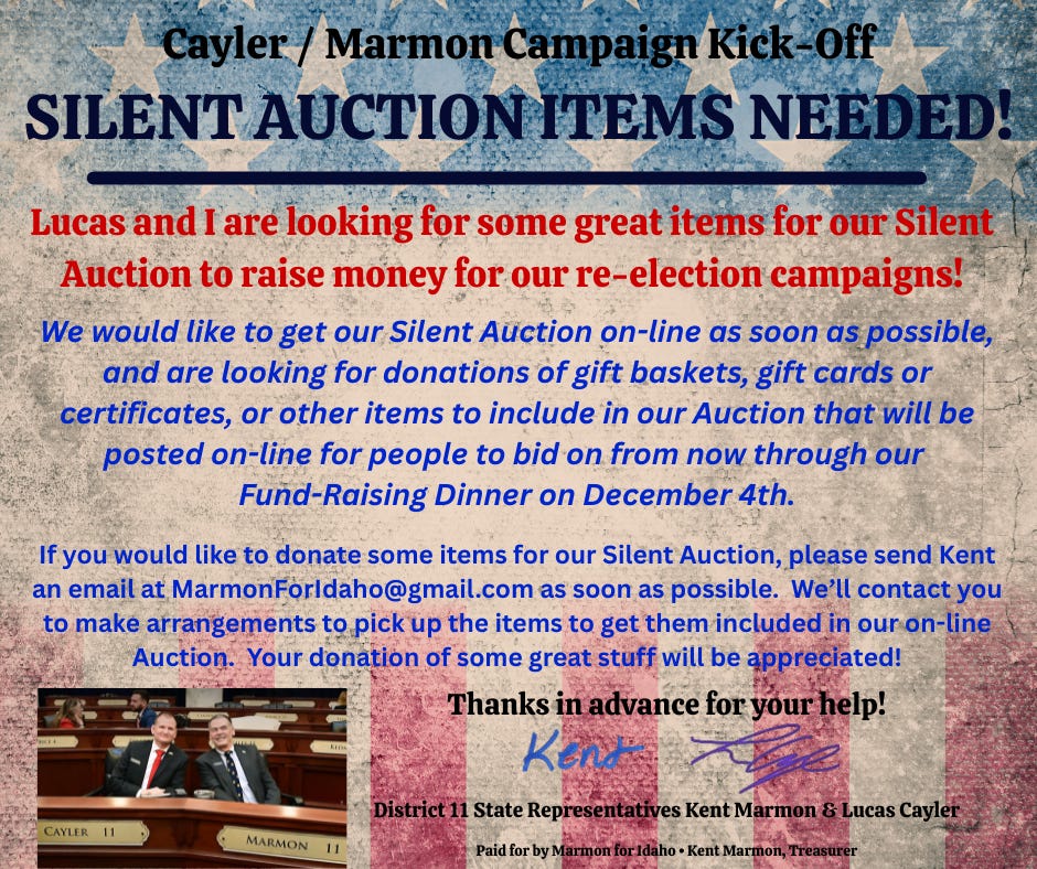 Note: Donations of items to the Silent Auction are counted as “in-kind contributions” and are recorded in our records as such to comply with Idaho’s Campaign Financial Disclosure Laws. These amounts are part of your cumulative total of allowable donations during an election cycle. One-half of your donation amounts will be distributed to each candidate (Lucas Cayler and me). Idaho Law allows donations of $1,000 per person per cycle ($1,000 in the Primary and $1,000 in the General). In addition, if you own a business, your business can donate $1,000 per election cycle.